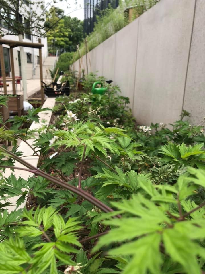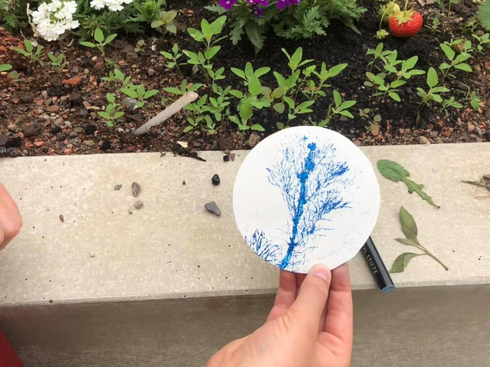 Unsere dritte Station war der neu angelgte Schulgarten der jahrgangsübergreifenden Gartengruppe des WDG mit Alexander Spletzer. Die ersten Pflanzungen waren schon im Boden. Nun sollten diese Schilder bekommen. Die Künstlerin Andrea Raak hatte dafür einen Pflanzen-Direktdruck vorbereitet, der den Schüler*innen für die Formenvielfalt der Blätter sensibilisierte und offensichtlich Spaß machte. Gedruckt wurde auf wetterbeständigem Steinpapier.